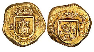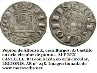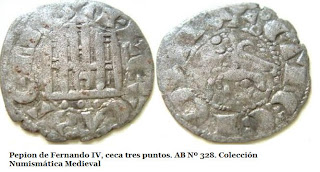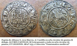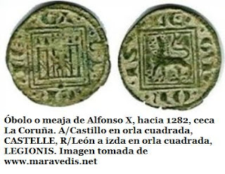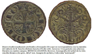 (10) La moneda de 13mm y 0.27g de peso en el anverso mantiene el tradicional león mirando a derechas, acimado por una cruz con vástago y leyenda +FERNANDVSREX. Fue en el reverso donde se incluyó toda la carga apostólica, representando una embarcación que transporta el cuerpo del Apóstol y a sus dos discípulos Atanasio y Teodoro (primer y segundo Epíscopos de Zaragoza, respectivamente), por encima, la leyenda SIA-COBI. Véase http://hnumisma.blogspot.com.es/2011/07/la-traslatio-del-apostol-santiago.html