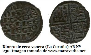 (12) En una cara de estos dineros se muestra el busto de frente de Santiago bajo el que se lee en semicírculo IACOBI. En el reverso se dibuja un león tras el cual se presenta una cruz y debajo REX. Veáse Roma Valdés, A. “Las monedas compostelanas entre 1157 y 1230” publicado en Gallaecia nº22, año 2003, pgs 369 a 382
