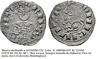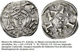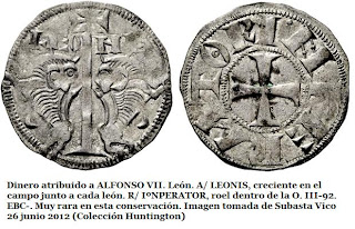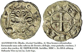 La revista numismática OMNI en el nº 5 de octubre de 2012 me dio la oportunidad de publicar este artículo sobre "La búsqueda de elementos románicos en las moneda castellano y leonesas de los siglos XI y XII" (también primera mitad del XIII). En esta entrada os dejo con el texto íntegro que fue publicado, si bien he incorporado una pequeña novedad y es la de una imagen de un dinero de Fernando II con retrato del Apostol Santiago, y que en su día no pude encontrar para ejemplificar la parte del texto en el que hablo sobre ella. La imagen ha sido tomada de la reciente subasta numismática de Vico de 14 de noviembre 2012 (Colección Huntington). Espero que os guste el artículo y como siempre agradezco vuestros comentarios, críticas y aportaciones.