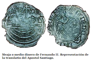 Hablando de Santiago, existe otra acuñación mítica de la ceca compostelana (10) de tiempos de Fernando II y que representa la escena de la traslación en una embarcación (11) del Apóstol Santiago y sus dos discípulos Atanasio y Teodoro (primer y segundo Epíscopos de Zaragoza, respectivamente). La moneda fue descubierta por el profesor Carro Otero de la Universidad de Santiago de Compostela en 1985 durante unas excavaciones en Adro Vello (O Grove, Pontevedra) y se conserva actualmente en el Museo de las Peregrinaciones.