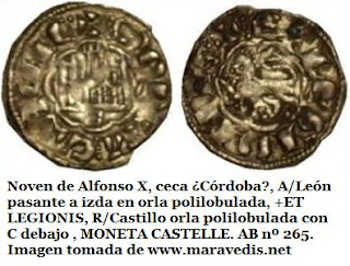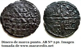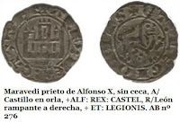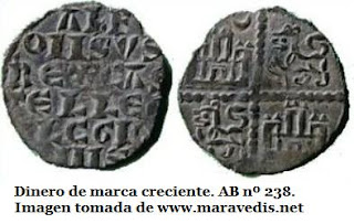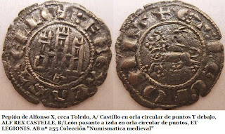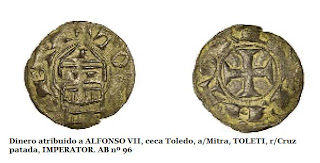 La primera acuñación castellano-leonesa, este magnífico dinero de Alfonso VI, acuñado inmediatamente después de la conquista de Toledo en 1085, responde a un tipo denominado “escritura visigótica” o “littera toletana” (15) . Aunque su aspecto puede recordar al de los trientes visigodos, no estamos ante el mismo tipo de escritura, dado que los visigodos empleaban el alfabeto latino (16) en sus monedas.
