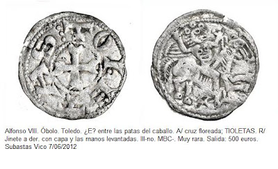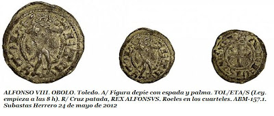 Ni que decir tiene que este tipo se corresponde, sin duda alguna, con una emisión realizada en el periodo de tutelaje estricto de Fernando II sobre Alfonso VIII. En ella se muestran a las claras dos conceptos novedosos: el primero es que ahora es el pequeño Alfonso el protagonista de la moneda, siendo representado junto a su nombre y bajo la titulación “Rex”, quedando complementada su regalía con la contextualización de su reino, es decir “Toletva”, que no era sino la declinación del nombre de su reino –recordemos que aún no se utilizaba en demasía diplomáticamente el término “Castella”- declinado por el nominativo neutro de la cuarta conjugación, y con un significado asimilable a la palabra “Toledos”, como semantizacióngeneralizante del término “Toletv”, hecho extensivo a todas las ciudades adscritas al dominio de su majestad. El segundo elemento peculiar es la exención del símbolo de la cruz, priorizando por tanto la imagen de carga política y propagandística de lo mostrado, sobre la simbología religiosa prototípica de la época. El mensaje a enviar nada tenía que ver con lo eclesiástico, sino más bien con lo terrenal, en un intento pleno por demostrar las buenas relaciones mantenidas por el rey de León –a quien ni siquiera se menciona- sobre la menor edad del verdadero “Rex” Alfonso.