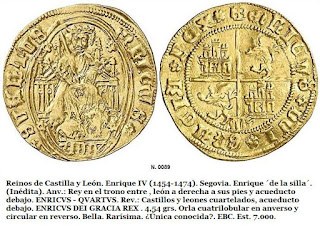 Enrique IV ordenó la acuñación de buenas doblas castellanas y medias doblas –con un nuevo tipo de estilo netamente francés- de 23 y ¾ quilates con talla de 50 y 100 en marco, corriendo a un valor legal de 210 y 420 maravedís respectivamente; y a las que más adelante decidió cambiarles el nombre -pese a tener todas las características prototípicas de las doblas-, llamándolas “enriques” y “medios enriques”. En su diseño utilizó a la sazón la representación regia armada y mayestática en trono, que documentalmente se llamó “silla”, diferenciándose unos de otros por tener o carecer de respaldo; razón por la que se les dio el apelativo de “enriques de la silla baxa” o “enriques de la silla alta”. Según los textos de la época, los enriques viejos sevillanos o de la “silla baxa” fueron los primeros en emitirse: “que sean como los primeros enriques que yo mandé labrar en Sevilla e que se llaman de la silla baxa", acuñándose con posterioridad los nuevos toledanos o de la “silla alta”, de arte más goticista, emitidos primeramente en Toledo, a ley de 18 quilates, con peso medio de 4,50, y valor de 350 maravedís, que sustituyeron en gran medida a la abundante dobla de la Banda labrada por su padre, Juan II.
